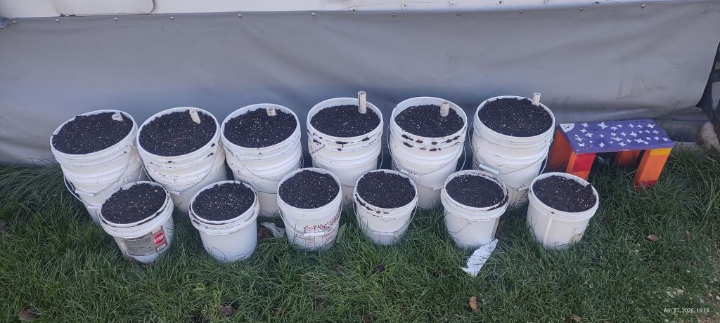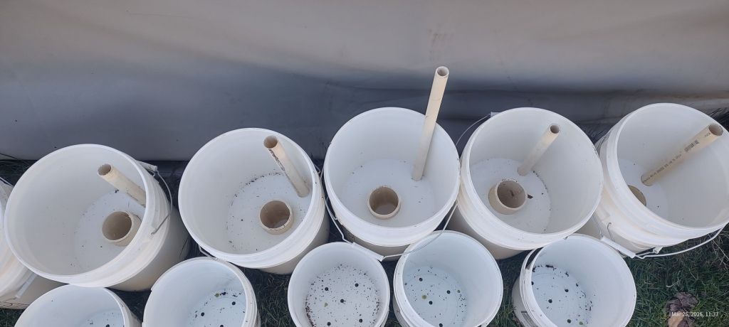 For the self watering buckets (the larger ones pictured) we ordered food grade 5 gallon buckets to fit the 3 1/2 gallon buckets into. The pipes go down to the reservoir for easy filling and also allowed us to keep the 5 gallon buckets intact in case we ever want to use them for something else.