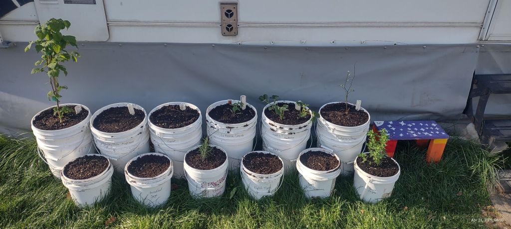 In the larger, self watering buckets: golden raspberry, calendula, carrots, roma tomato, strawberries, and a blueberry bush.